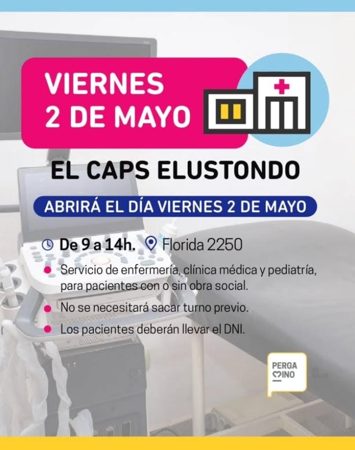 Mediante las redes sociales, la Secretaría de Salud de la Municipalidad de Pergamino informó que el CAPS Pedro Elustondo abrirá sus puertas este viernes 2 de mayo.