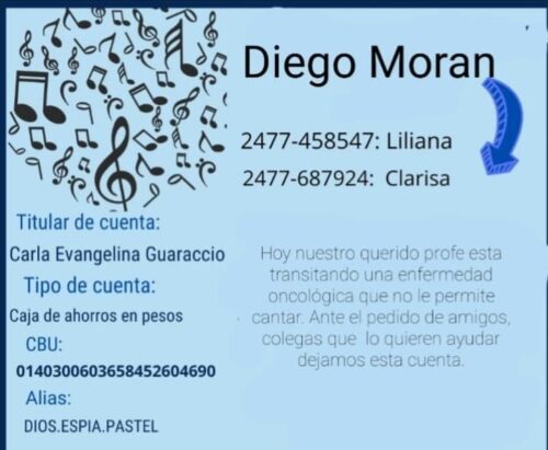 El reconocido profesor de música, cantante y director de coros de nuestra ciudad, Diego Morán, se encuentra atravesando una enfermedad oncológica y necesita la ayuda económica de todos para solventar los viajes y tratamientos.