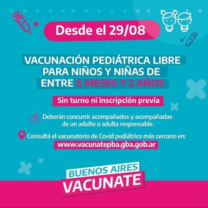 El ministerio de Salud de la Provincia de Buenos Aires dio a conocer que desde hoy lunes 29 de agosto se pone en marcha la vacunación pediátrica libre en el territorio bonaerense.