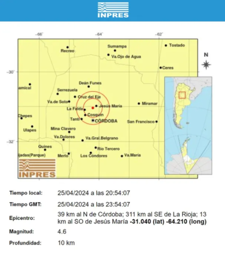 El movimiento sísmico fue de 4.6 en la escala de Richter, según detalló el Instituto Nacional de Prevención Sísmica (Inpres). La locación precisa fue a 39 kilómetros al norte de Córdoba; 311 km. al sureste de La Rioja; y 13 km. al suroeste de Jesús María.