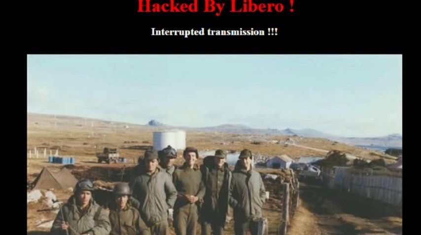 Junto al video, la web muestra las leyendas «#LasMalvinasSonArgentinas», «transmisión interrumpida» y «hackeada por Líbero» (estas dos últimas en inglés).