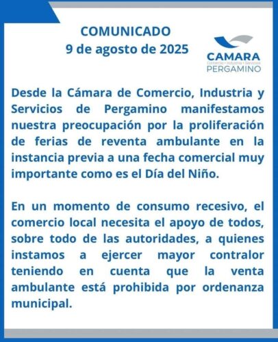 “Desde la Cámara de Comercio, Industria y Servicios de Pergamino manifestamos nuestra preocupación por la proliferación de ferias de reventa ambulante en la instancia previa a una fecha comercial muy importante como es el Día del Niño”. Comenzaron el comunicado.