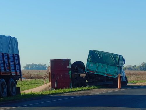 Entre la localidad de Manuel Ocampo y nuestra ciudad, por cuestiones que se desconocen, un camión Mercedes Benz intentó esquivar un automóvil Volkswagen y terminó volcando su acoplado, perdiendo toda su carga tras perder la estabilidad.