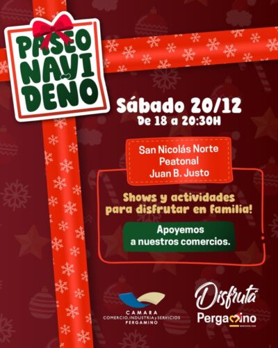 El próximo sábado 20 de diciembre, a partir de las 18 horas, se llevará a cabo en Pergamino el Paseo Navideño, una iniciativa articulada entre la Municipalidad de Pergamino y la Cámara de Comercio, que se desarrollará en las principales zonas comerciales de la ciudad: Avenida Juan B. Justo, Peatonal San Nicolás y San Nicolás Norte.