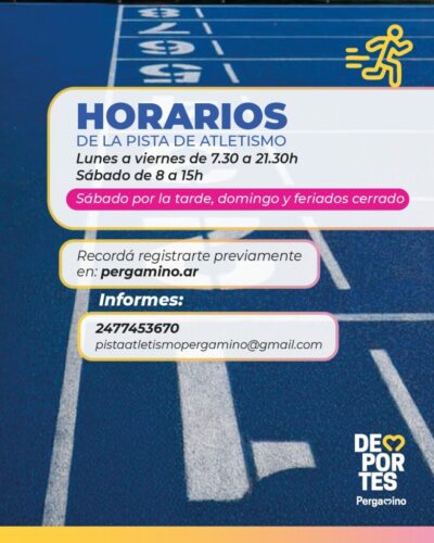 Para colaborar en el registro y mayor información ante cualquier duda, el Municipio incorporó como vías de comunicación el whatsapp 2477-453670 y el correo electrónico pistaatletismopergamino@gmail.com.