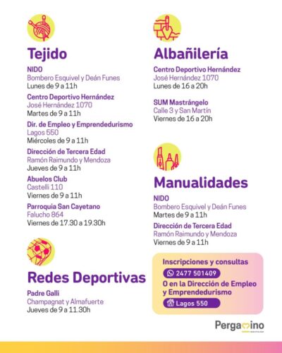 Las inscripciones para los nuevos talleres del Programa Emprender comienzan hoy jueves 8 y se extenderán hasta el viernes 23 de enero con un pago único de tres mil pesos para cada uno de ellos. Los interesados pueden anotarse a través del link: https://bit.ly/TalleresE ; o bien pedir más información a la línea de WhatsApp: 2477501409. Las propuestas son: