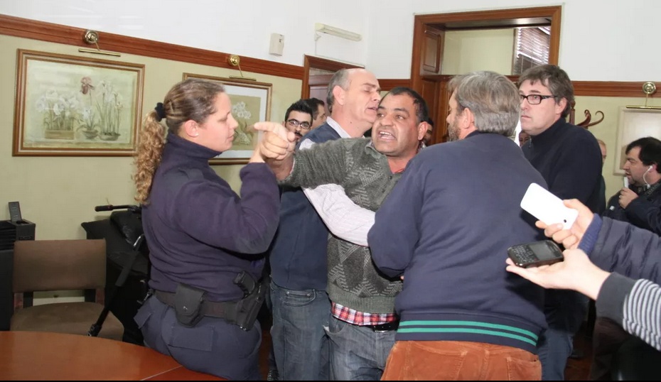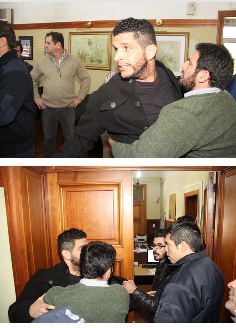Este hecho sin precedentes tardaron varios minutos en traer calma, ya que los propios médicos se acercaron al escritorio para reclamar que haya diálogo al Intendente, mientras el delegado Raúl Benítez, era también quien pretendía a los empujones y a los gritos llegar al jefe comunal acusándolo de que este le había dicho traidor.