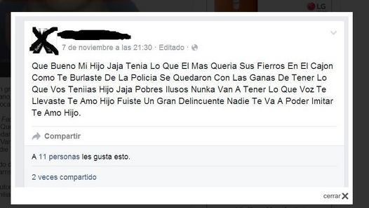 En su perfil de Facebook, la mujer escribió un breve texto para despedirse del joven. «Que Bueno Mi Hijo Jaja Tenia Lo Que El Mas Queria Sus Fierros En El Cajon Como Te Burlaste De La Policia Se Quedaron Con Las Ganas De Tener Lo Que Vos Teniias Hijo Jaja Pobres Ilusos Nunka Van A Tener Lo Que Voz Te Llevaste Te Amo Hijo Fuiste Un Gran Delincuente Nadie Te Va A Poder Imitar Te Amo Hijo (sic)», publicó.