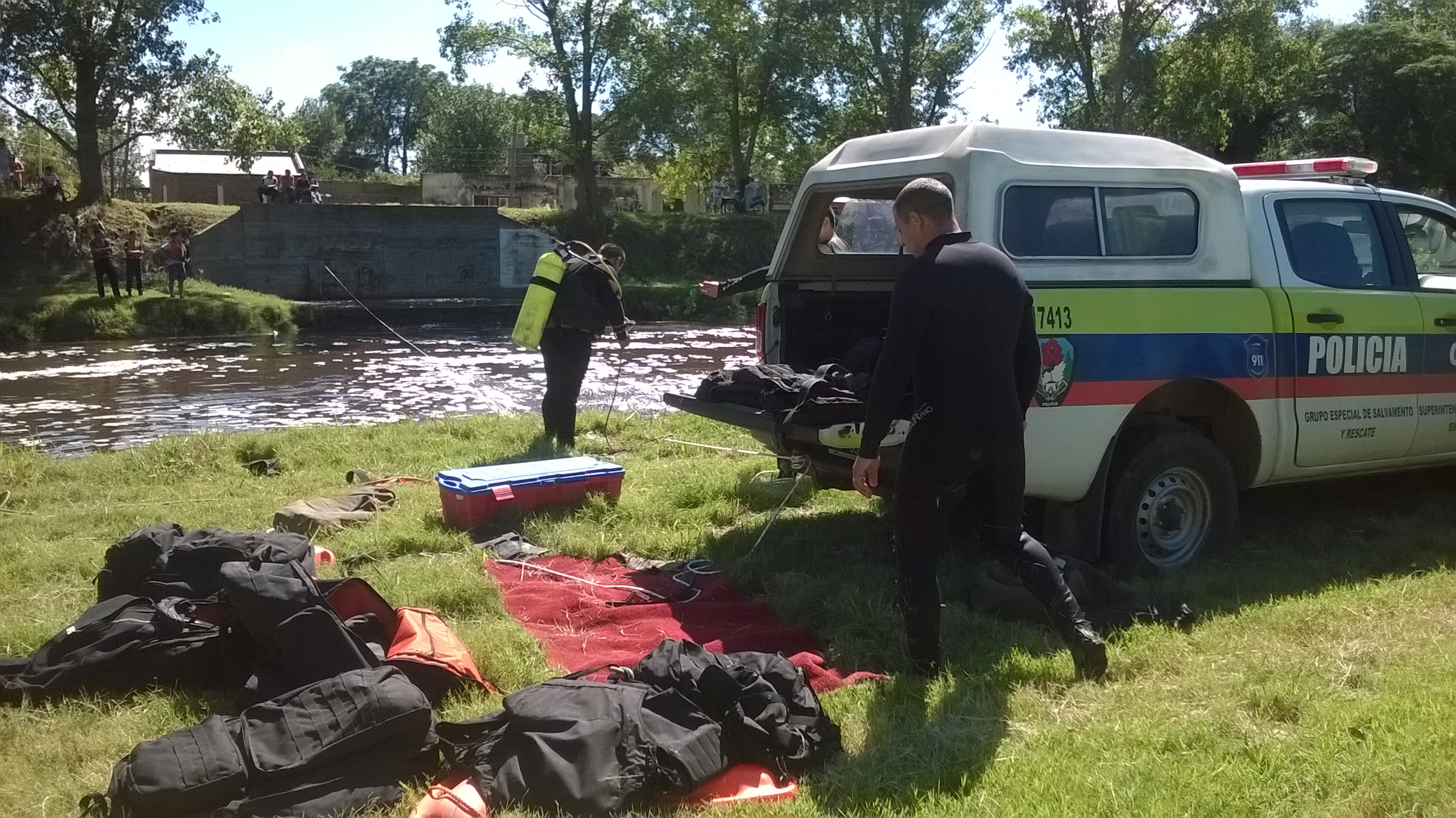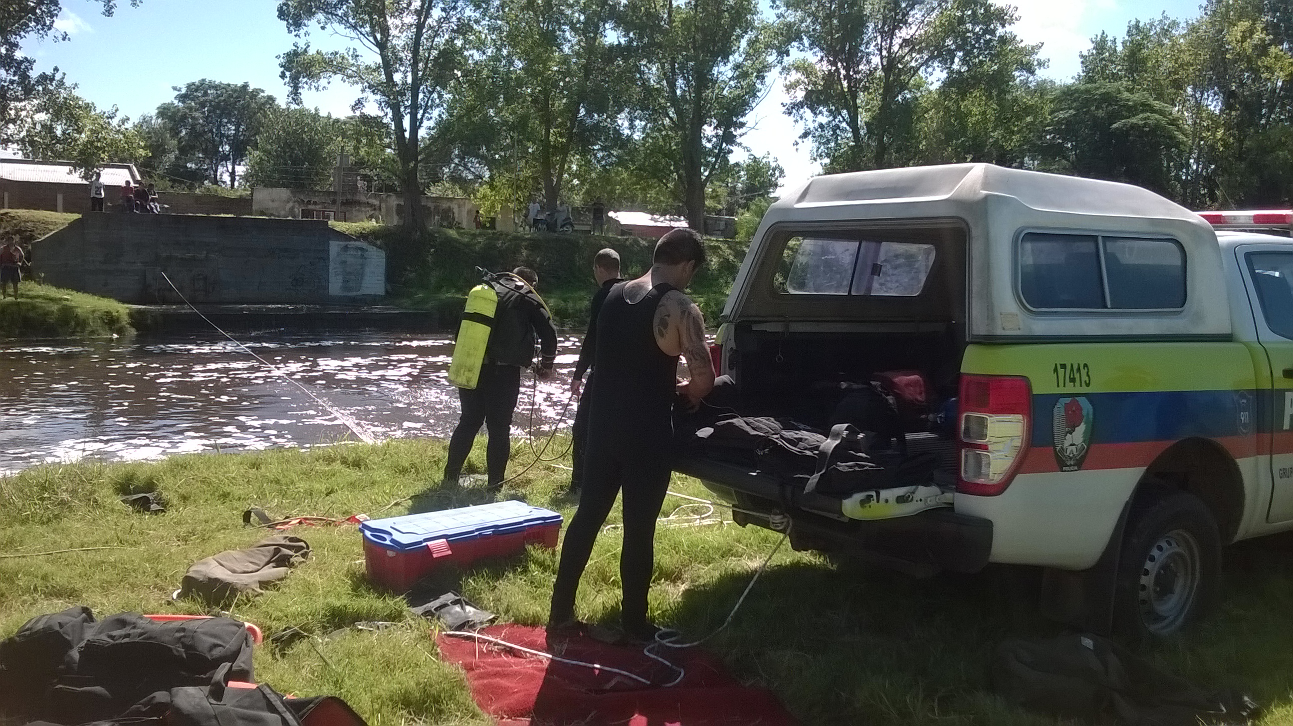 Personal de Bomberos Pergamino , junto con buzos de bomberos de policía trabajan en las aguas del arroyo pergamino para dar con el paradero del menor Agustín Zulewski quien habría caído a las aguas cerca de las 14 hs. del dia viernes cuando se encontraba pescando en el puente «Rocha».