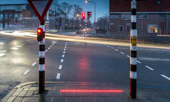 Esta herramienta se coloca a nivel del piso y trabaja en sincronía con los semáforos peatonales tradicionales. Posee luces LED que son fácilmente distinguibles tanto de día como de noche y su consumo energético es más eficiente. Además, está construido en acrílico sellado lo que impide el ingreso del agua y sus terminaciones están hechas en aluminio.