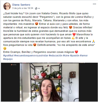 En esta oportunidad, el objetivo era realizar un encuentro virtual, dado el contexto de pandemia, con la cineasta Lorena Muñoz. Al respecto, expresaba en su cuenta de Facebook, agradecida y emocionada, la docente: “Soñar es realizar 😍 Hoy nuestra clase de Literatura e indagación sobre los símbolos se hace con invitada de lujo: Entrevistamos a LORENA MUÑOZ, cineasta y directora de ‘Gilda, no me arrepiento de este amor’, galardonada por la Asociación Argentina de Críticos de Cine con el Premio Cóndor de Plata a la Mejor Dirección, también conocida por su película ‘El Potro, lo mejor del amor’”. Y, allí, tras agradecer a sus colegas por el acompañamiento, remarcaba que “Un docente solo acompaña, ayuda a abrir puertas y, fundamentalmente, aprende hasta el último minuto de su vida. Definitivamente, si hay una misión, es sostener y expandir la apertura.”