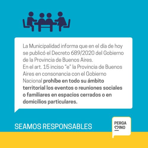 El funcionario indicó que esta prohibición es independiente de la cantidad de personas que se reúnan, es decir, hasta hace unos días en Pergamino podían realizarse reuniones sociales de hasta 10 personas, pero a partir de hoy las reuniones sociales o familiares en espacios cerrados están prohibidas por disposición del Gobierno provincial.