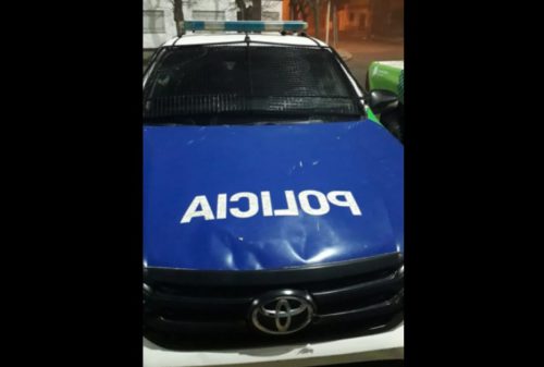 Al llegar el móvil policial el tumulto de personas se dispersó e iniciaron los ataques hacia el vehículo de la fuerza de seguridad.