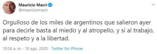 Hoy por la mañana, el ex presidente de la República Argentina, Mauricio Macri, twiteó desde su cuenta oficial de Twitter: “Orgulloso de los miles de argentinos que salieron ayer para decirle basta al miedo y al atropello, y sí al trabajo, al respeto y a la libertad”, escribió.