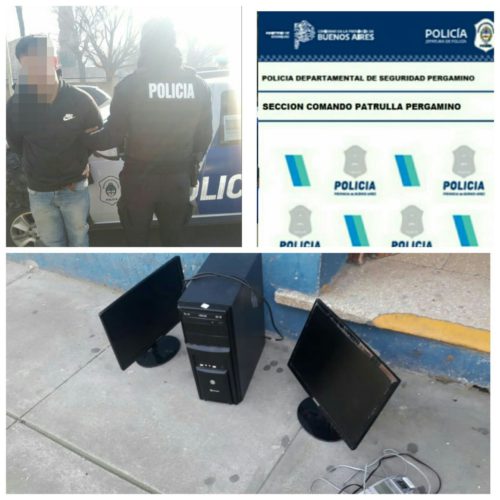 El sábado 22/08/20 a laslas 10:00 hs.A raíz de un llamado al 911 en  calle Castelli nº 1270 se detuvo a un sujeto de 22 años, quien previo romper la puerta de ingreso  del Club Sport sito en calle Estrada y San Martín, sustrajo  2  monitores, 1 CPU, 1 Posnet y secuestro de cuchilla en un domicilio cercano.Interviene UFIyJ nº 6 Pergamino.
