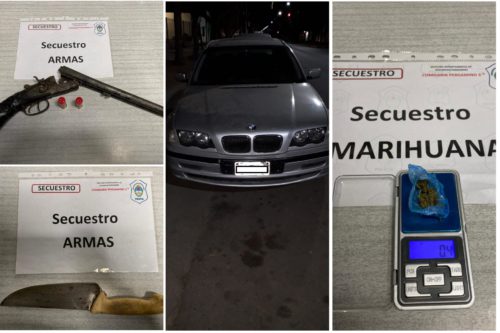 El domingo 30/08/20; a las 02:00 hs. A raíz de un llamado a la linea de emergencias 911. Se hace presente personal policial de Cria. 3ra y Pto. Vigilancia La Guarida en Ruta 32 Km 4, en distribuidora “REB GAS” donde se entrevistan con un sujeto quien refiere que momentos antes habrían intentado ingresar violentando puertas de oficinas aportando características físicas de masculinos y vehículo en el que se movilizaban, se realiza recorridas en inmediaciones donde procede a la aprensión de dos sujetos de 31 y 37 años y al secuestro de Escopeta Calibre 16 antigua sin numeración ni marca visible, la cual contenía cartucho colocado, cuchilla de 30 cm de largo, un automóvil marca BMW y envoltorio de nylon el cual contenía en su interior sustancia marihuana con un guarismo de 0.4 gr. Injerencia UFI 8 Pergamino. Act secuestro y aprehensión a Cria 3ra.-