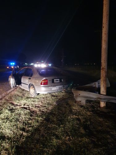 Antes de la medianoche del miércoles en ruta 188 y Pellegrini se produjo el despiste y posterior impacto de un automóvil Rover 416 contra una columna de alumbrado provocando lesiones en las dos personas que lo ocupaban.