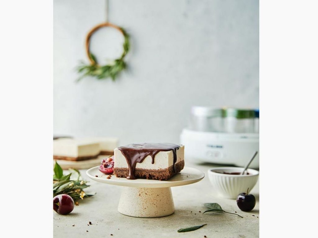 Cortar cuadraditos y servir con salsa de chocolate y frutos rojos a gusto. Pueden convertirlo en postre helado, si llevan la placa de dos a tres horas al freezer antes de servirlo.
