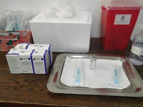Cumpliendo el estricto protocolo para su correcta implementación, cada vial contiene cinco dosis y es retirado del freezer -especialmente acondicionado- al corroborar que las cinco personas citadas están presentes y en condiciones óptimas para ser vacunadas. Se espera el tiempo requerido para que la temperatura ambiente vuelva líquido el vial y así poder dosificar las cargas y realizar el procedimiento de vacunación, que en esta primera instancia es de cinco personas por hora.