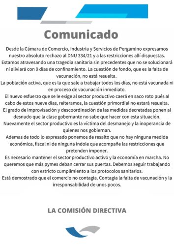 En las primeras horas del día de hoy la Cámara de Comercio de Pergamino emitió un comunicado rechazando el Decreto Presidencial.