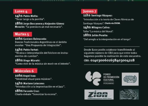 El VII Encuentro de música popular de Pergamino está auspiciado por el “Fondo de promoción cultural 2021” y por los comercios locales: Julio Apud, Zion informática y La Sala.