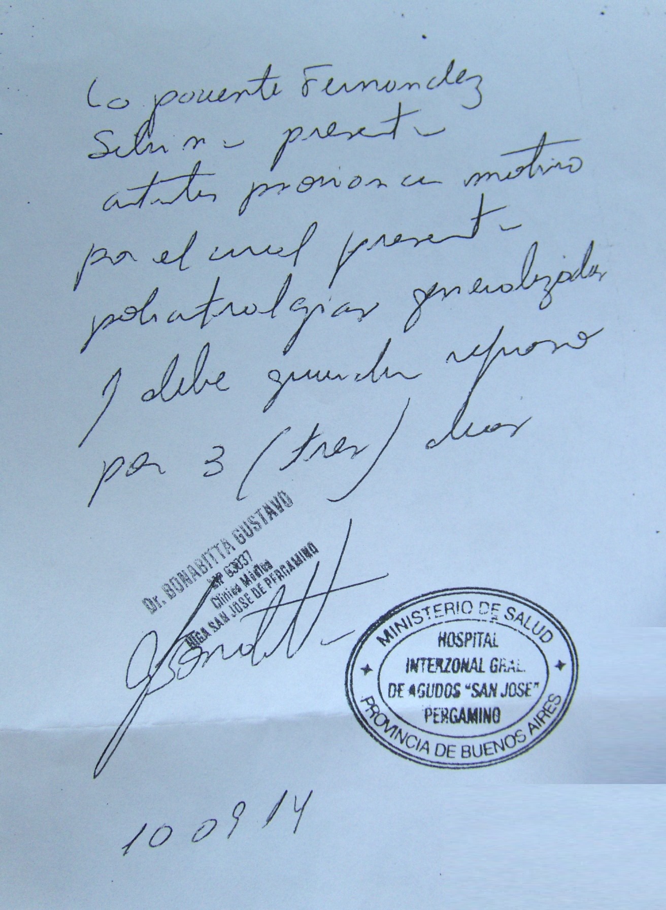El día 10 del corriente la señora Silvina Fernandez , la cual padece de «poliartralgias generalizadas» que afecta sus articulaciones, presenta un certificado medico donde el especialista le aconseja guarde reposo por tres días.